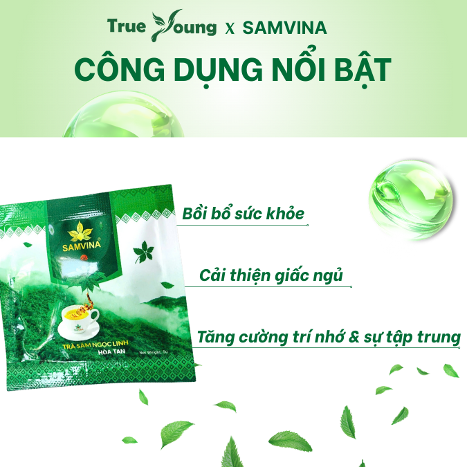 Trà hòa tan sâm Ngọc Linh SÂMVINA, Trà là sản phẩm hoàn hảo cho sức khỏe, mang lại nhiều lợi ích cho mọi lứa tuổi. Với công thức độc đáo từ lá và thân sâm Ngọc Linh, trà giúp thanh lọc cơ thể và tăng cường thể trạng tốt cho cơ thể.